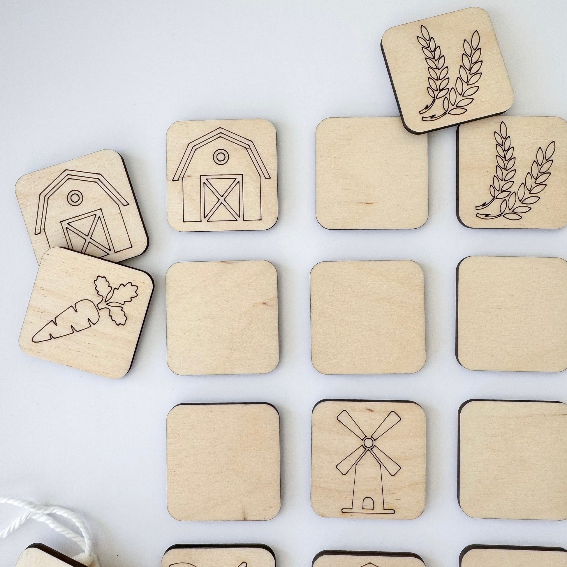 Our farm themed matching memory game makes an enchanting addition to your family's game collection! With 24 beautifully crafted wooden tiles featuring 12 pairs of farm and nature-inspired motifs, this game promises endless hours of fun and cognitive stimulation.