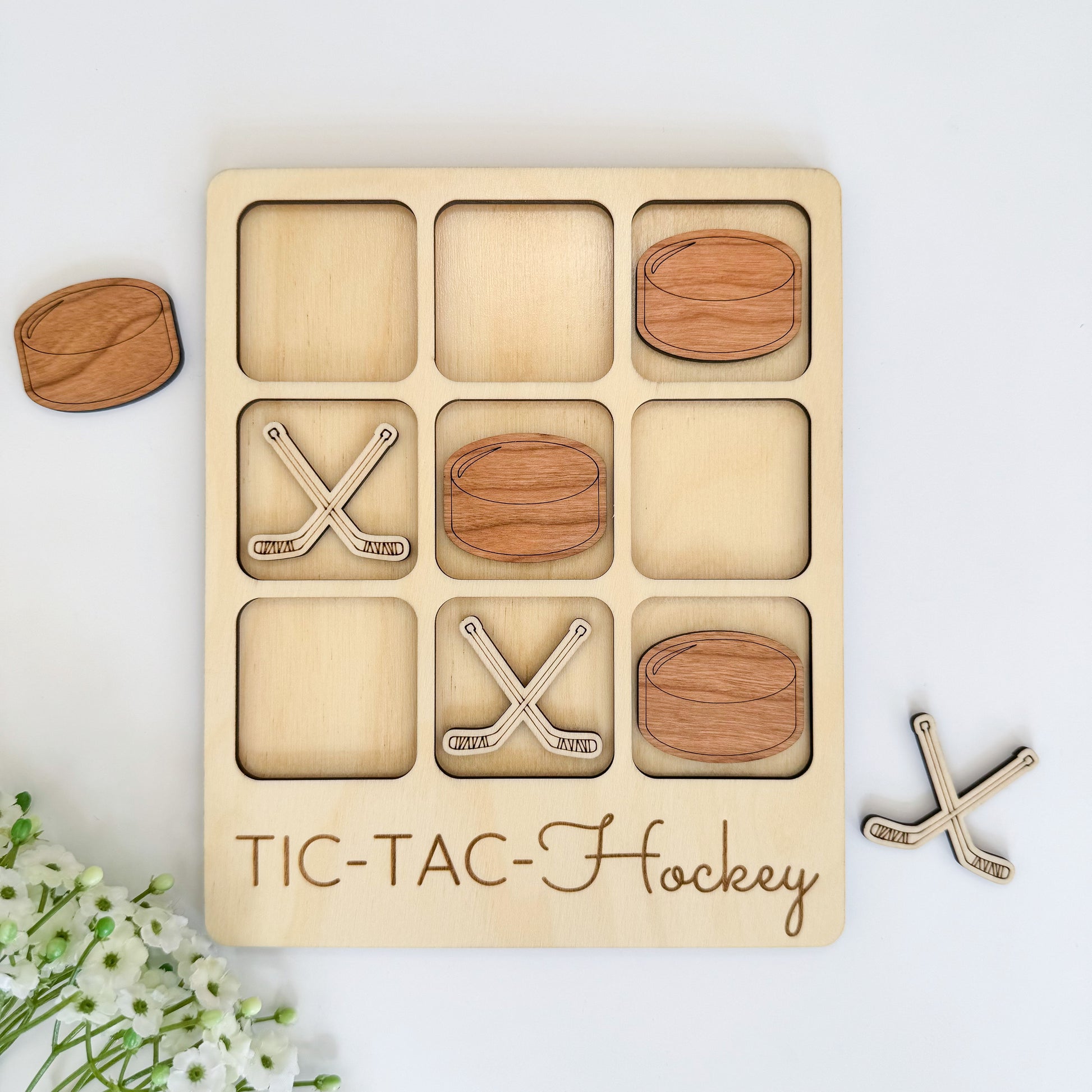 Our hockey-themed Tic Tac Toe board is a true work of art, featuring hockey stick and hockey puck playing pieces. This wooden game creates a visual delight for enthusiasts of the hockey and adds a unique charm to your gaming experience.