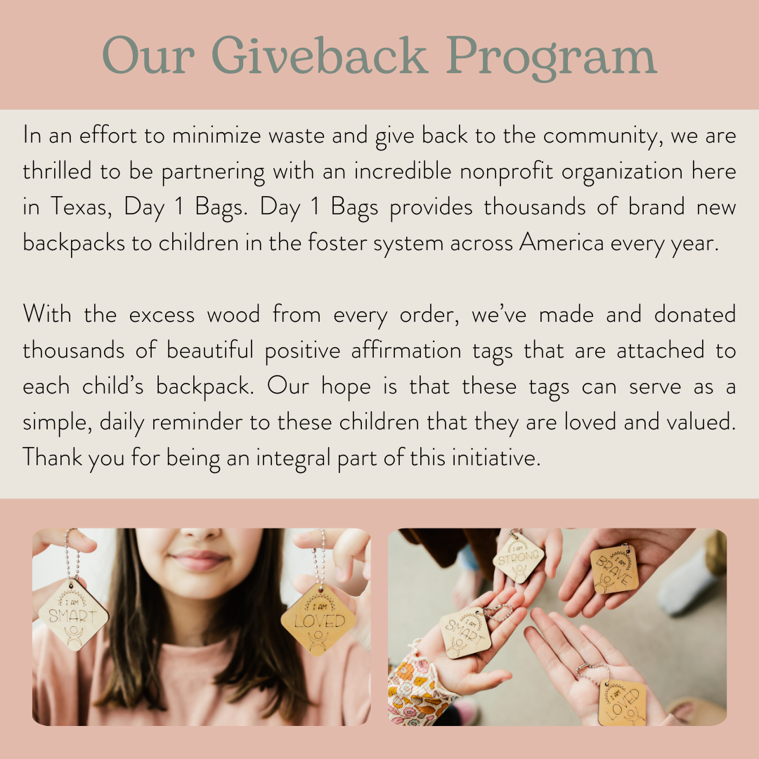 With every purchase you make, we create multiple positive affirmation keychains that are distributed to children in the Foster System across America.